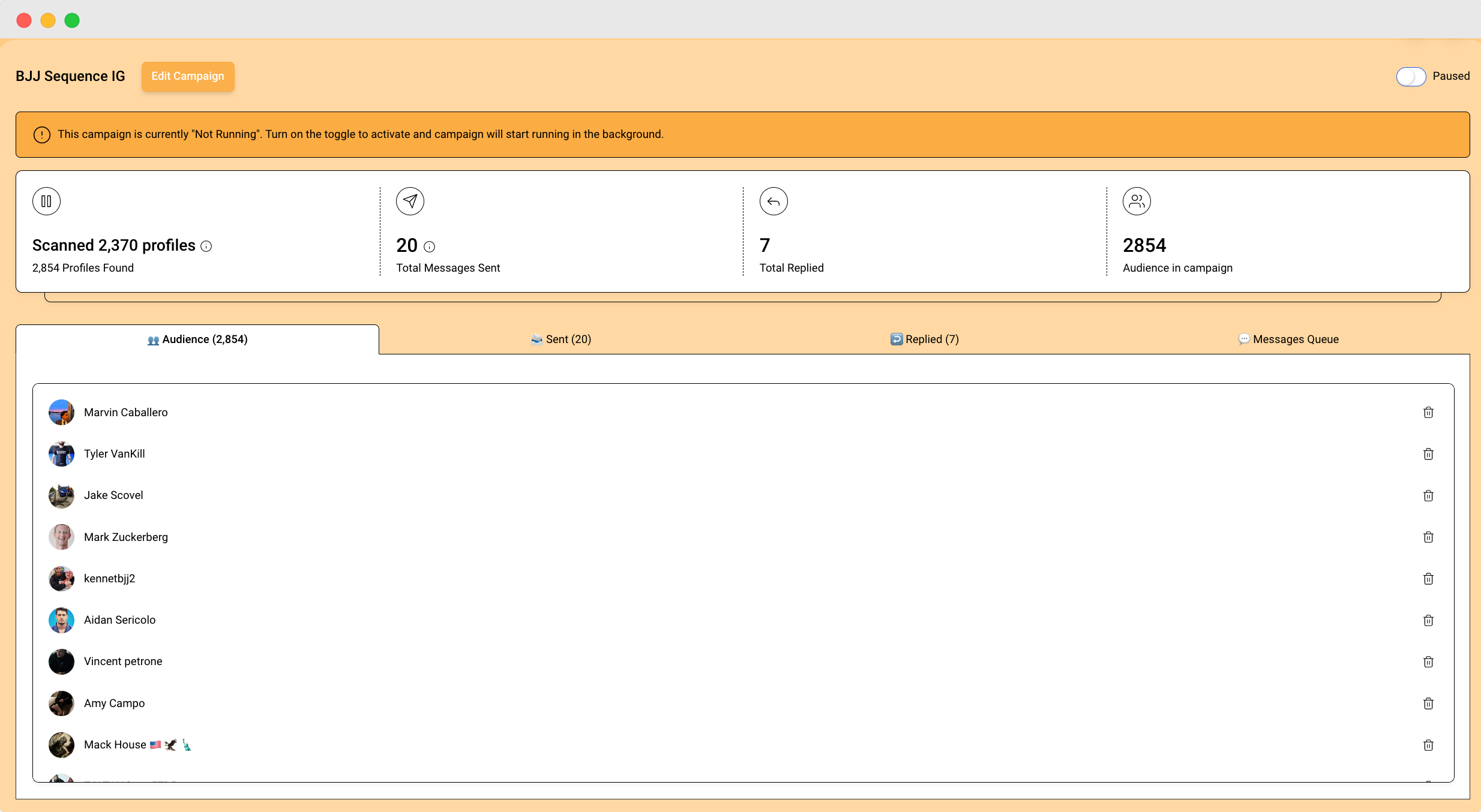 You can monitor your campaign progress, audience you're sending friend request or the sequence of messages and how many of them are responding to your requests. This helps you stay on top of what's going in your campaign.