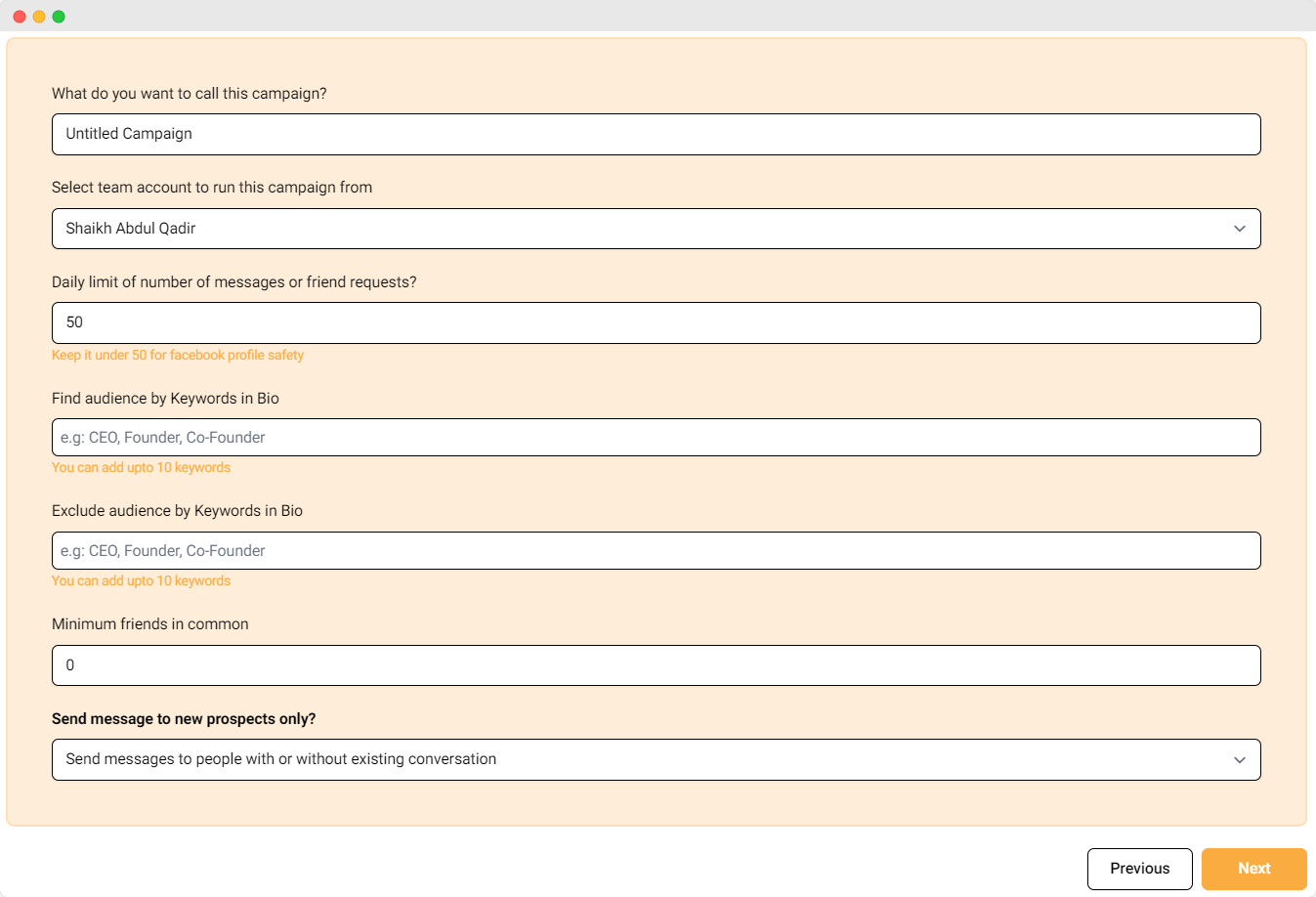 Include and exclude audience by keywords in their profile bios, define your own campaign level limits, also minimum mutual connections. You can choose to send friend request or messages sequence, or even both. Personalise your messages using variable and spintex.